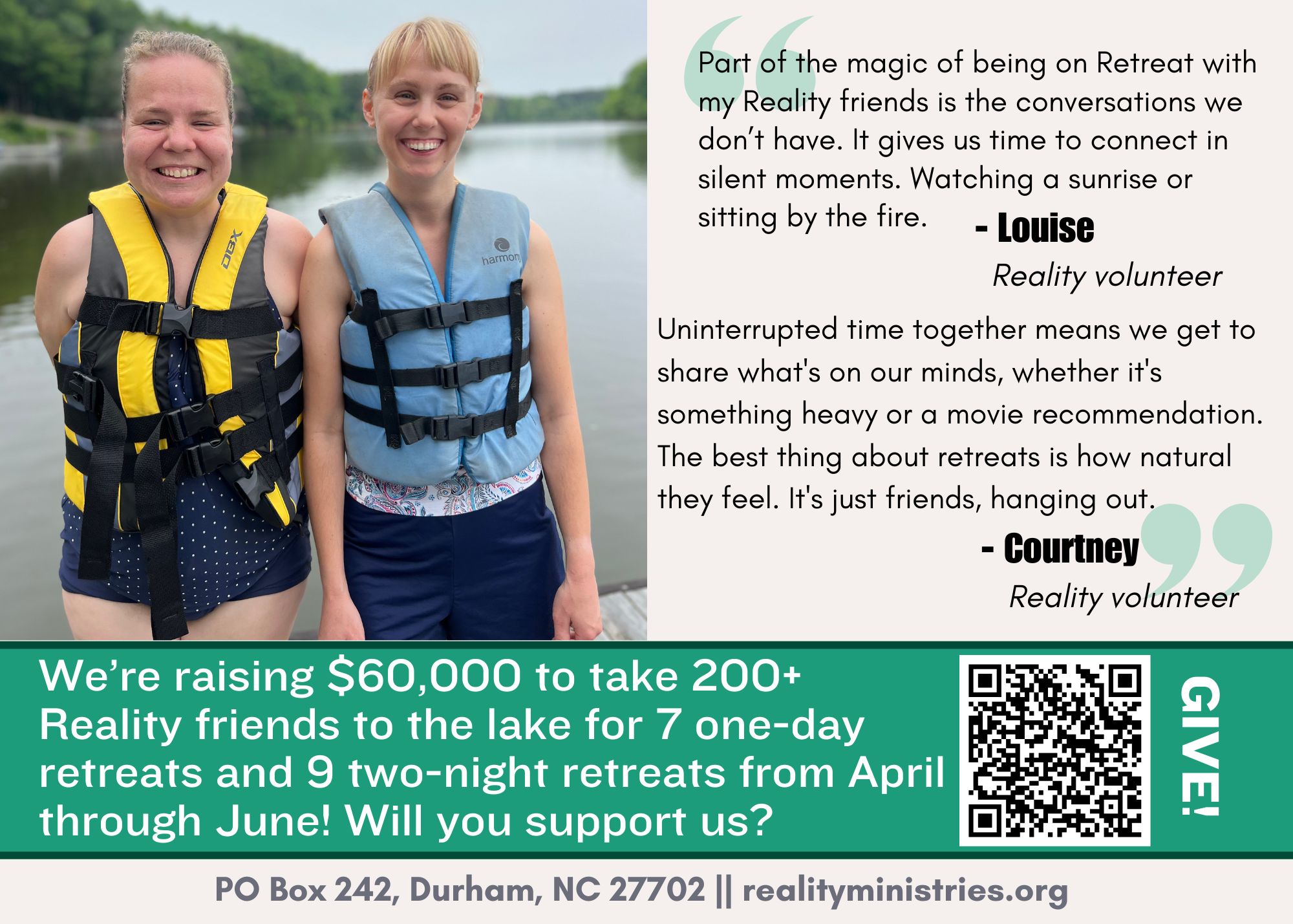 We’re taking 200+ Reality friends to the lake for 7 one-day retreats and 9 two-night retreats in April through June ! We’re aiming to raise $60,000 to bring our friends on the adventure.