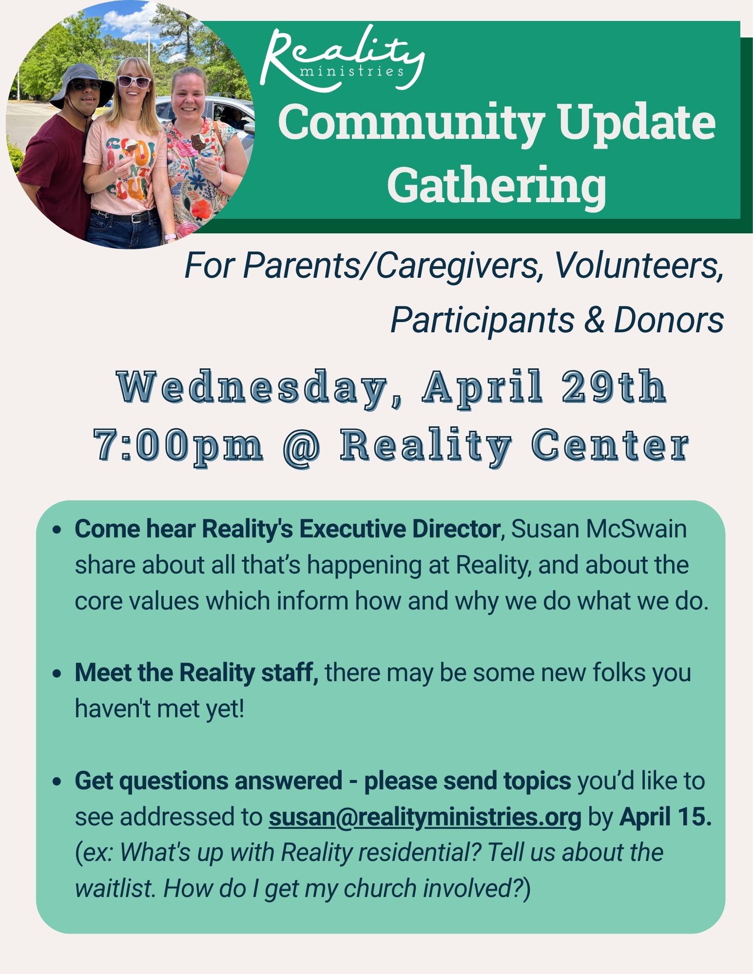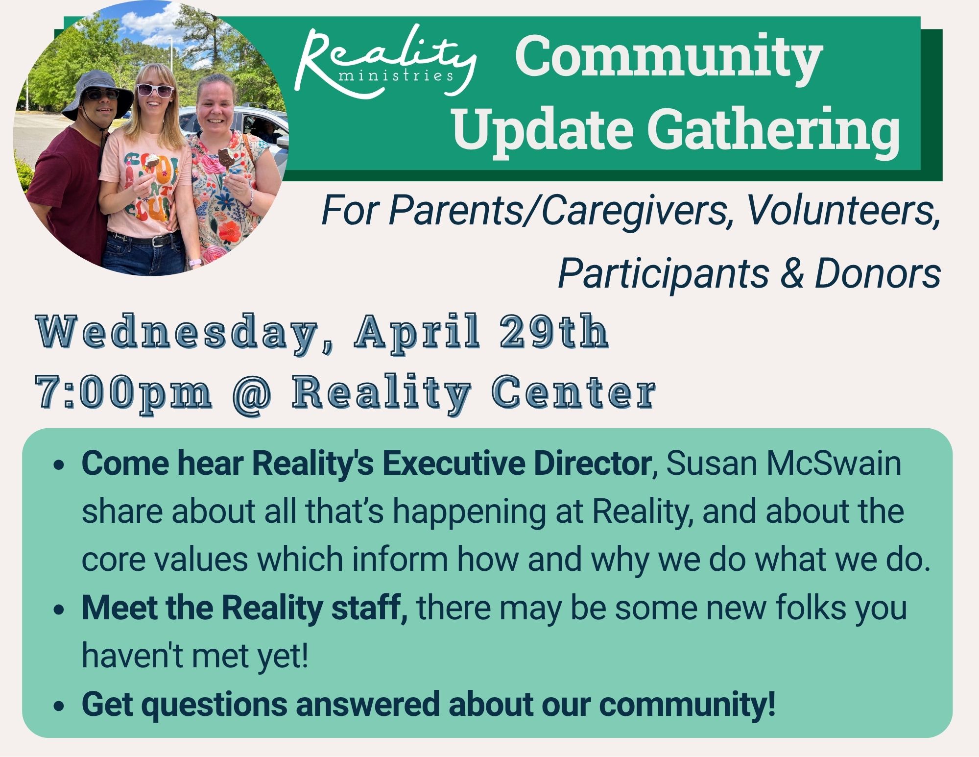 All caregivers, volunteers, participants, and supporters are invited to to hear about what’s happening at Reality, meet staff, and ask questions about our community!