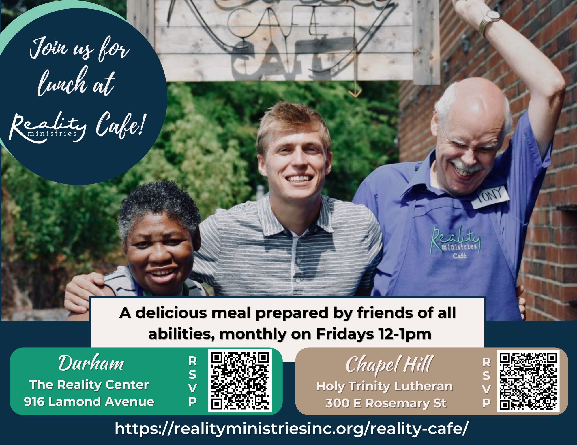 The Cafe is a delicious, three-course lunch prepared and served by friends of all abilities. We host this once a month on Fridays at the Reality Center and in Chapel Hill from 12-1pm. (See upcoming dates and RSPV Here.)